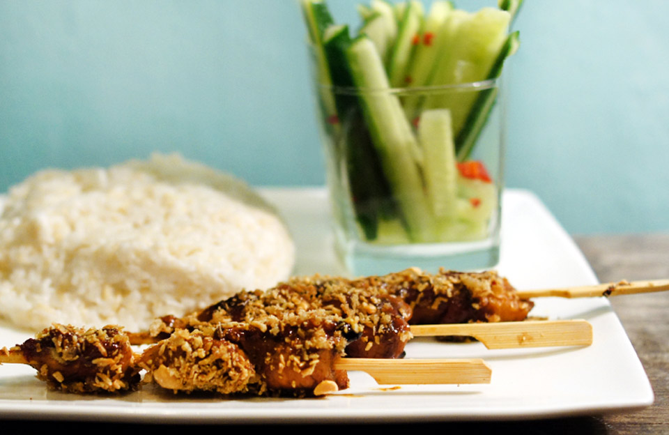 Wat doe je? Je mengt de Sate marinade (van Conimex) met een eetlepel ketjap, een flinke scheut wokolie en wat water) en daar doe je in stukjes gesneden kipfilet in. Doe er wat verse rode peper bij en schep een paar keer om. Dit laat je zo lekker lang marineren (maak dit bijvoorbeeld ‘s ochtends en laat ‘t de hele dag in de koelkast staan). Tegelijkertijd maak je lekkere frisse komkommerstengels door de helft van een komkommer in dunne reepjes te snijden, deze te overgieten met azijn en er wat gewone suiker overheen te strooien. Dit mag je ook lekker lang laten staan. Als je dan echt gaat koken rijg je de saté aan prikkers en bak je de stokjes in 10 minuutjes gaar. Regelmatig keren! Daarbij kook je wat rijst in kokosmelk gaar (heel vet, maar HEEl lekker). Bij het opdienen doe je de komkommerstengels in een glas en daar strooi je nog wat rode peper over. Als dip kun je er lekker sweet-chili-saus bij doen. De rijst leg gewoon op je bord en de satéstokjes haal je nog even door wat Seroendang (Conimex) zodat het er een beetje aan blijft plakken. Et voila! Dan heb je een heerlijke Aziatische maaltijd!