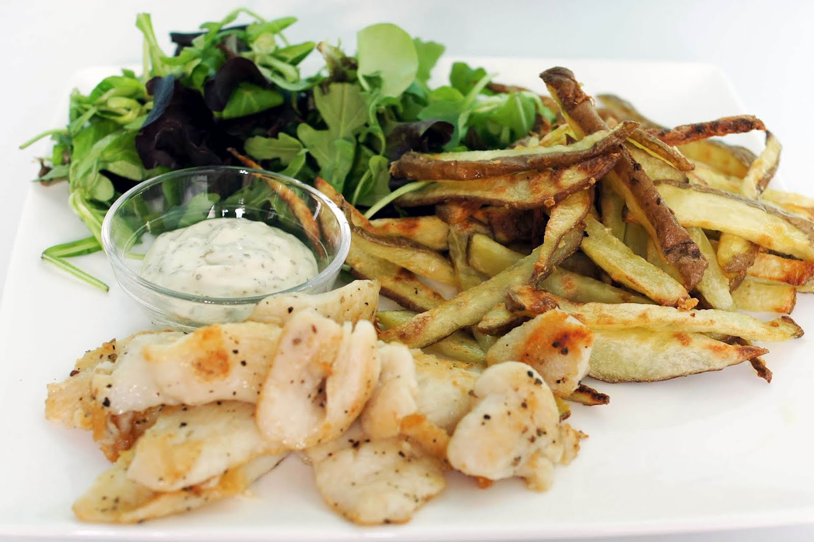Je snijdt een grote aardappel in dunne reepjes en laat dit even wellen in water. Dan droog je de reepjes af en haal je ze door olijfolie met drie geperste knoflooktenen. De patat leg je op een rekje in de oven en bak je 25 minuten op 220C. Ondertussen kun je dan de pangasius wokken (ik gebruikte AH pangasius voor in de wok met zout&peper) en maak je de sla zoals je zelf wil.