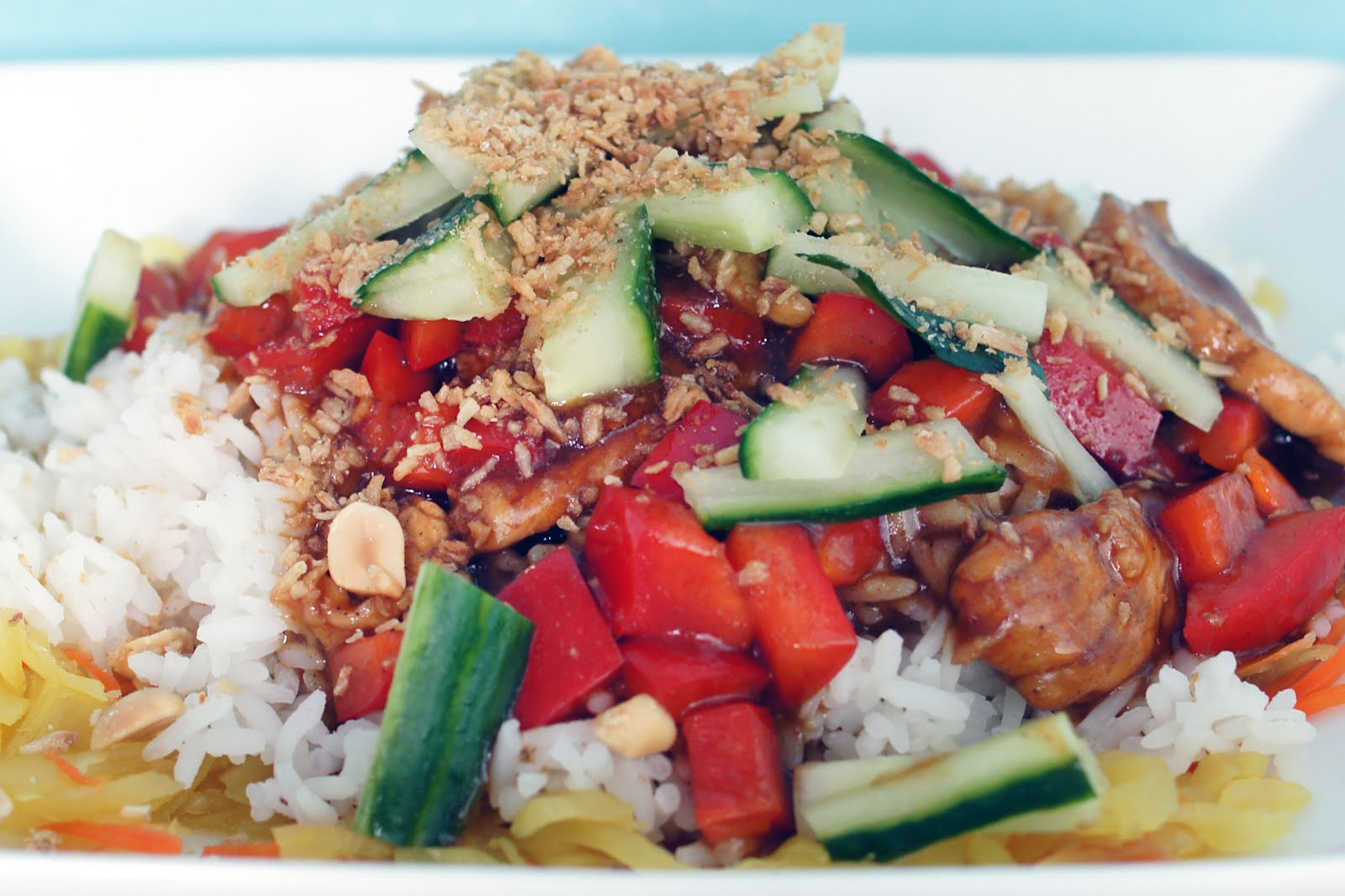 Je snijdt een kipfilet in reepjes en legt deze ongeveer 10min in wokolie met de marinade van Conimex. Ondertussen snij je een rode paprika en komkommer in kleine stukjes. Je kookt de rijst en wokt de kip op hoog vuur. Als de kip gaar is voeg je hier de saus (water met de sausmix van Conimex) en paprika aan toe. Dit breng je aan de kook en zodra het kookt zet je het vuur zachter en laat je het pruttelen. Als de rijst klaar is en de saus mooi dik, kun je gaan opdienen. Begin met een laag Atjar Tjampoer (Conimex, zure groente), dan rijst en de saus en top af met de komkommer en wat Seroendeng (Conimex, geroosterde kokos met pinda’s). Ook lekker met Bali kroepen (ook Conimex).
