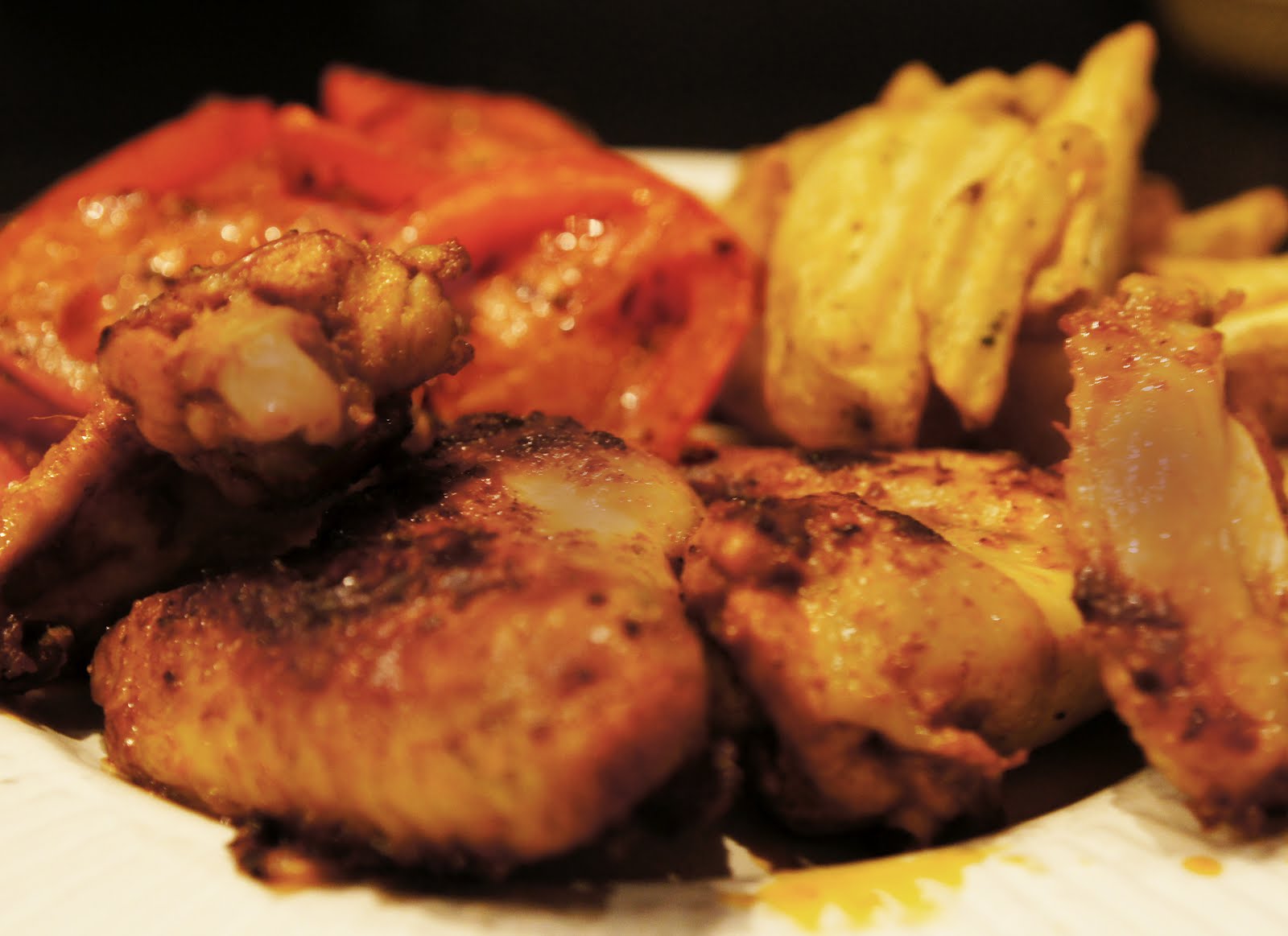 Ik at dus kippenvleugeltjes uit de oven en tomaat bespeurd met knoflook, peper, zout en balsamico sladressing en ook die in de oven. Met lekkere kruidige aardappelpartjes van de Appie! Het was lekker! Ik heb er ook al eens eerder over geblogd, geloof in september ofzo.. 🙂