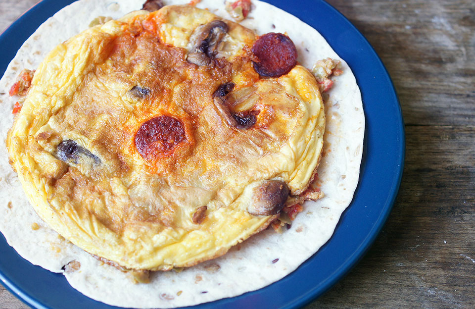 Ik maakte een omelet van twee geklopte eieren, champignons en wat chorizo. Die deed ik samen met een prutje van olijf en rode peper (AH tapanades) op een meergranenwrap. En dat was ‘t.