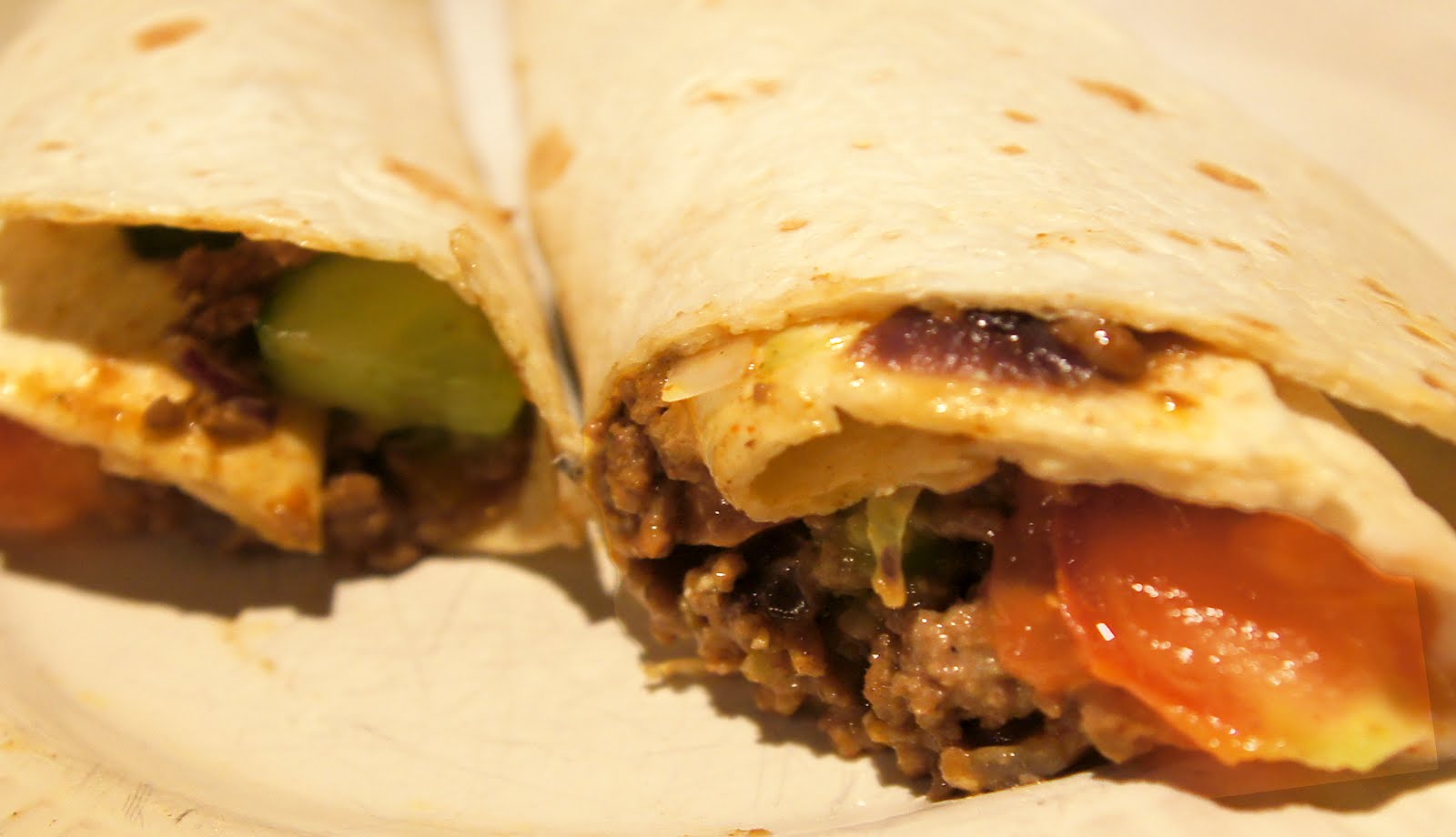 Gehakt rullen, gele paprika erdoor, 2 rode uien, burrito kruiden van TexMex en eten met knoflooksaus, tomaten en komkommer. Lekker! Maar ‘t was heel snel koud, jammer genoeg. Anyway, we zitten weer vol en dat was ‘t doel:)