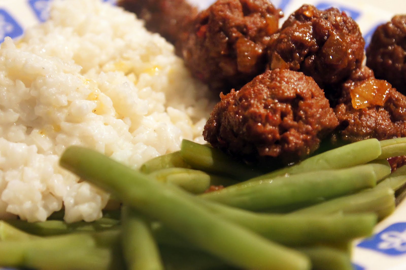 Goedenavond! Vanavond heb ik weer heerlijk gegeten: pittige gehaktballetjes met kokosrijst, pindasaus en boontjes.