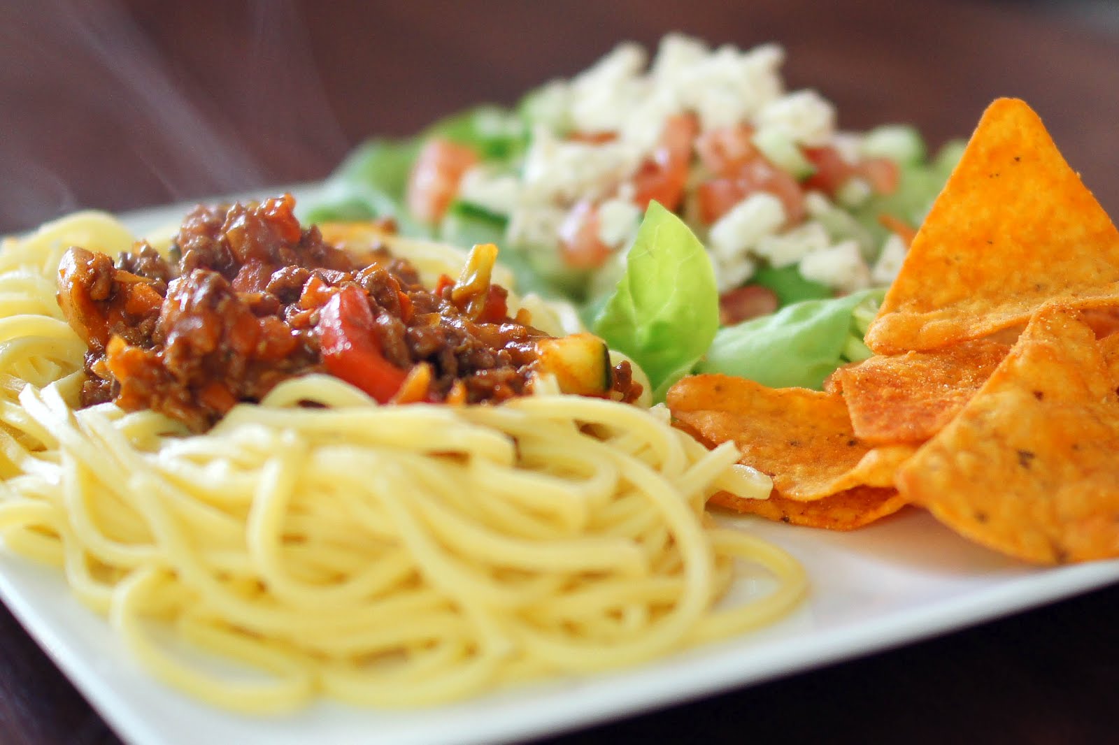 Wat apart! Ik heb nog nooit eerder gezien dat iemand spaghetti met dorito's heeft gegeten. Ziet er wel onwijs lekker uit allemaal!
