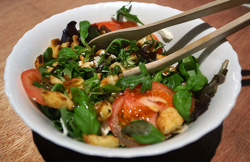 De salade maak je met veldsla, pasta (ik had vlindertjes), een tomaat, 1 bol buffelmozzarella, een paar blaadjes basilicum en balsamico sladressing. Over de salade heb ik dan nog zelfgemaakte (HEERLIJKE) croutons gedaan. Die maak je door in blokjes gesneden maïsbrood in een bakje met olijfolie, 1 teen knoflook en zout te mengen en dit even (5 minuutjes ongeveer) te bakken in een koekenpan (tot ze knapperig zijn).