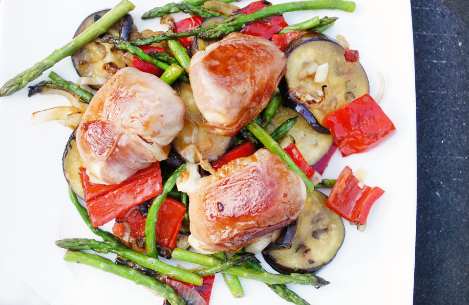 Je snijdt de bollen mozzarella in 2en en legt deze in een bakje. Daarbij doe je het sap van een uitgeknepen limoen en wat peper en zout. Ondertussen snij je een stukje van de onderkant van de aspergetips er af, snij je een rode puntpaprika in grove stukken en de aubergine in plakjes van 5mm. Ik deed er nog ui bij, maar die kun je beter achterwege laten (bah). Alle groentes doe je in een bak en daar strooi je wat zout&peper over, flink wat olijfolie en wat limoensap. De groentes grill je dan portie voor portie (omdat er anders teveel in de pan ligt) in een koekenpan. Ondertussen vouw je de gezuurde mozzarella in plakjes parmaham. Als de groentes klaar zijn bak je de mozzarellapakketjes eventjes aan zodat de kaas zacht wordt en de ham knapperig. Dan doe je op ‘t laatst heel even nog de groentes in de pan, voor wat extra smaak van de ham en om op te warmen en dan dien je op (groentes op je bord en mozzarellapakketjes er bovenop).
